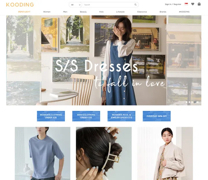 韩国一站式时尚网店Kooding,从基本款T恤至流行街头风设计服饰,应有尽有。要是收货时发现尺码不对,Kooding提供免费退货服务,客服声誉甚佳。这家网店一大卖点之一是竟然有售卖现代式韩服,还有各种古代韩式首饰,任君挑选。