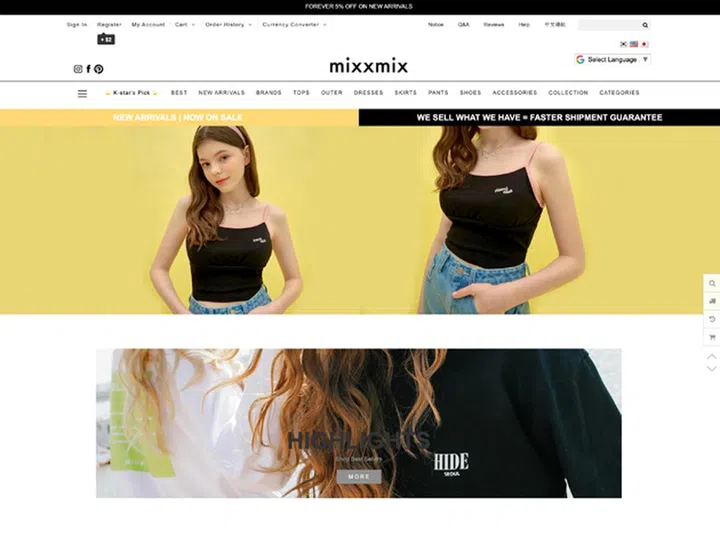 Mixxmix除了是网店,还有推出自家的品牌。 这家网店上的单品选择从可爱型到性感风都有,因此深受青少年与二十几岁女生的爱戴。网站上的各国语言选项,更是方便海外韩迷的购买程序,无需Google Translate也能在网站上扫货。