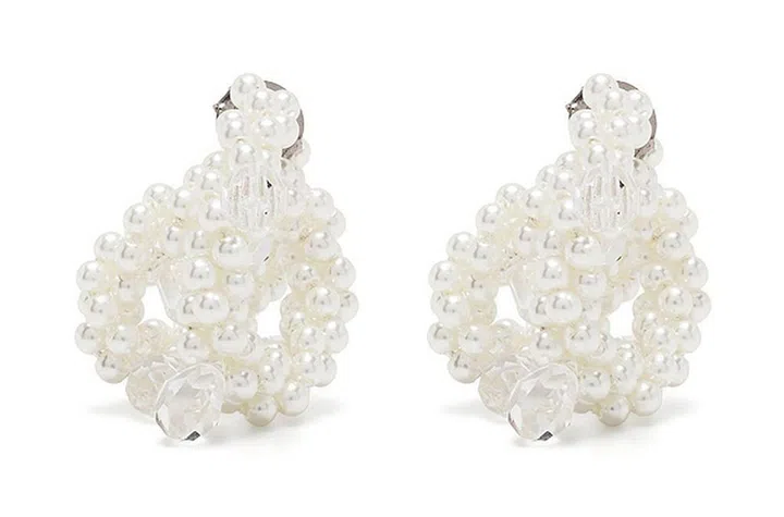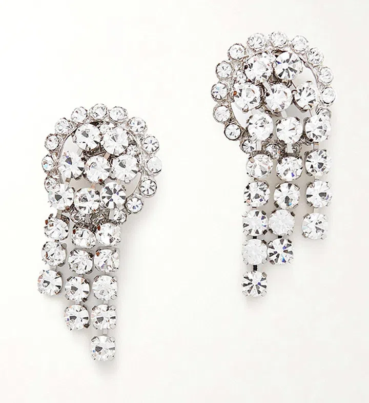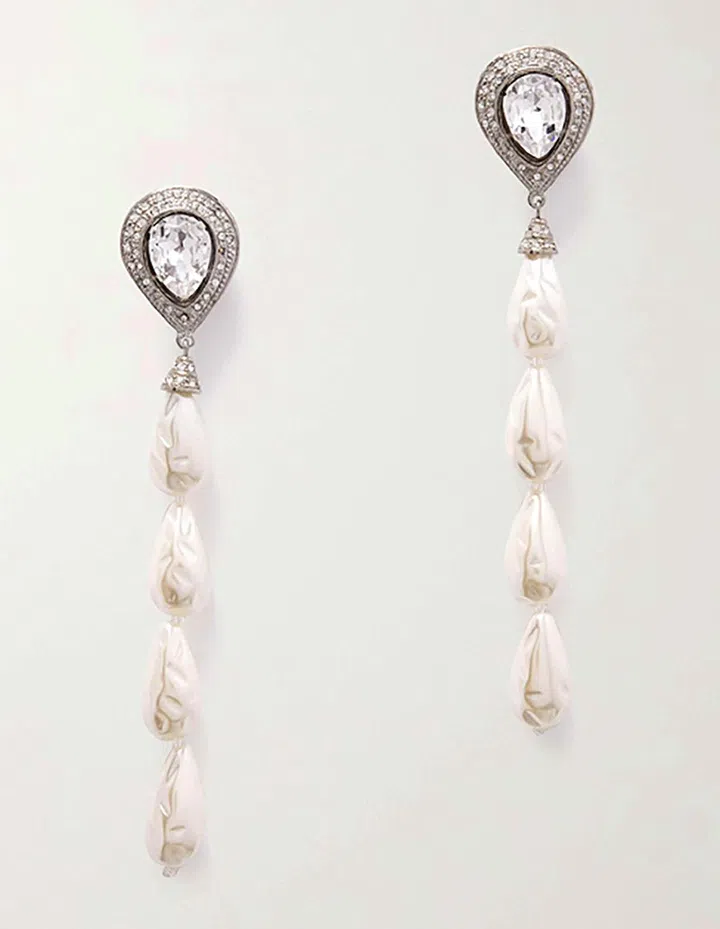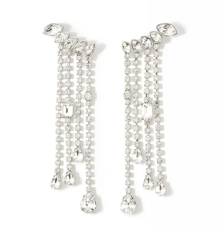 醒目的水晶耳坠下面外加长长的珍珠元素挂坠,带有一丝华贵复古气质。穿着丝质衬衣,可展现韩剧女主般的优雅风范,搭配礼服长裙,又能完美驾驭迷人晚宴造型。