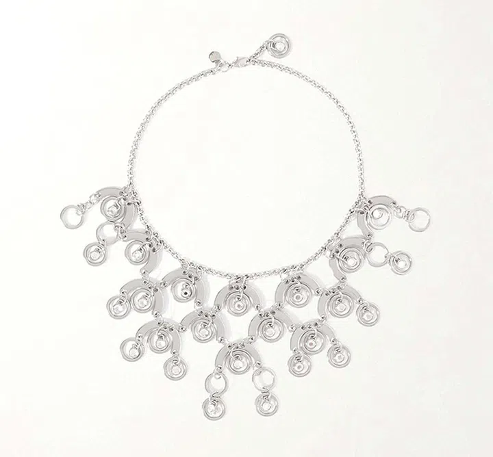 项链长度犹如一款choker,佩戴起来在颈项较高位置。下面的装饰元素来自品牌的标记性链甲元素,可随身体的运动而起伏,其间点缀水晶,让造型既隆重又不沉重。