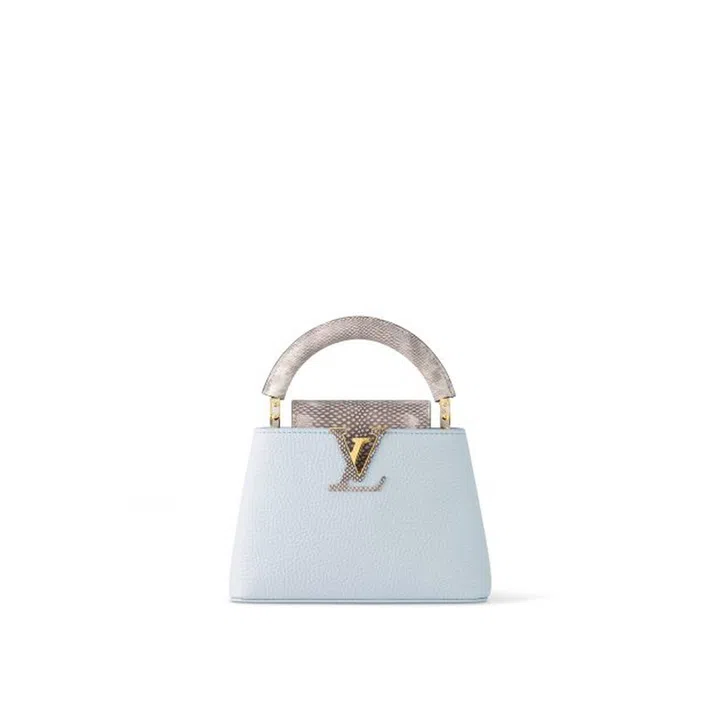 2013年首推的Capucines手袋,以品牌1854年位于rue Neuve-des-Capucines的第一间店命名。其袋饰以独特半镂空“LV”标志,而衔接包身及提把的金属圆环上的铆钉,灵感则源自品牌经典旅行箱的装饰。值得一提的是,这款包包不仅人气值极高,品牌还自2019年推出Artycapucines艺术合作项目,让艺术家们将Capucines手袋当作空白画布发挥创意,为Capucines手袋带来了无尽的生命力。上图这款Capucines Mini手袋,以柔美的淡蓝色Taurillon皮革与珍贵Karung皮革形成鲜明对比,释放呼之欲出的野性魅力。