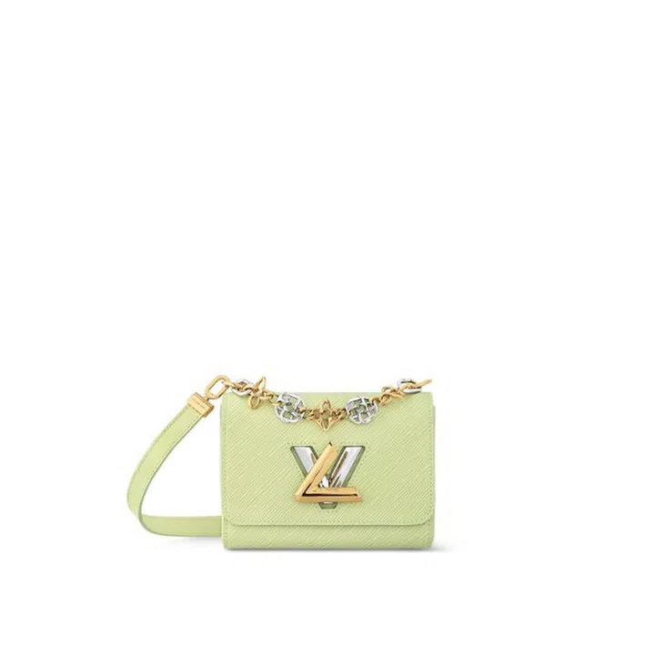 延伸自Pochette Trapeze的Twist链袋,在2015年早春T台上首次登场,好玩之处是其金属“LV”标志搭扣,只需转动“L”字母搭扣让其与“V”交叠即可解锁。上图这款配色清新的Twist PM手袋,不仅装饰金银双色的旋转锁扣,还配有一条由Monogram花卉组成的金银双色链条,造型精致,散发都市活力。