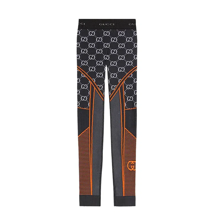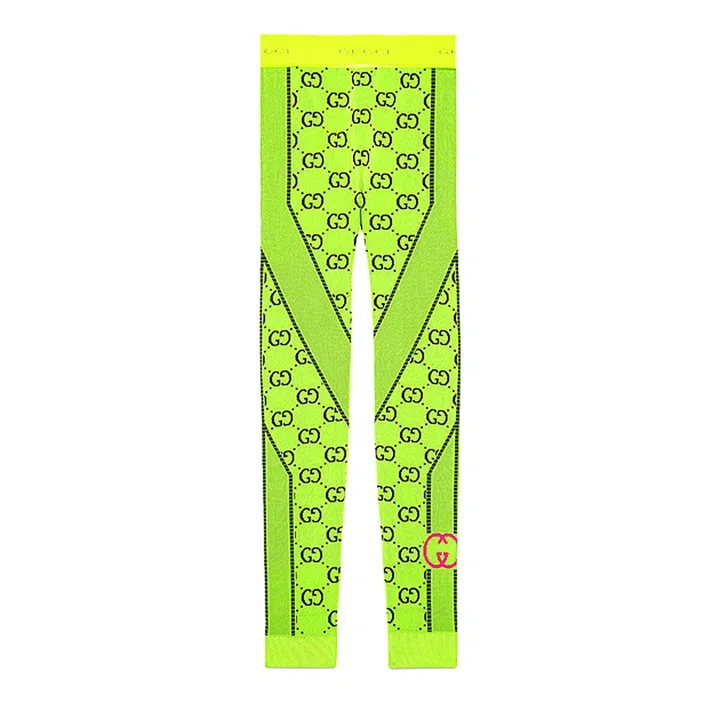 Gucci Love Parade系列推出的GG jersey jacquard leggings,采用前卫大胆的荧光色调,可搭配长款小西装穿着,或者用该款式的短裤版本搭配黑网袜+高筒靴。