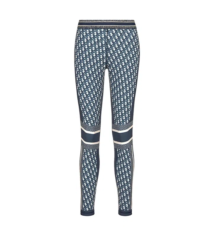 采用蓝色Dior Oblique图案装饰的科技面料裤袜。品牌的造型方式是同款图案的短裤+外套+裤袜+丝质visor头饰,搭配简约白上衣,以及散发未来感的银色调网面球鞋。