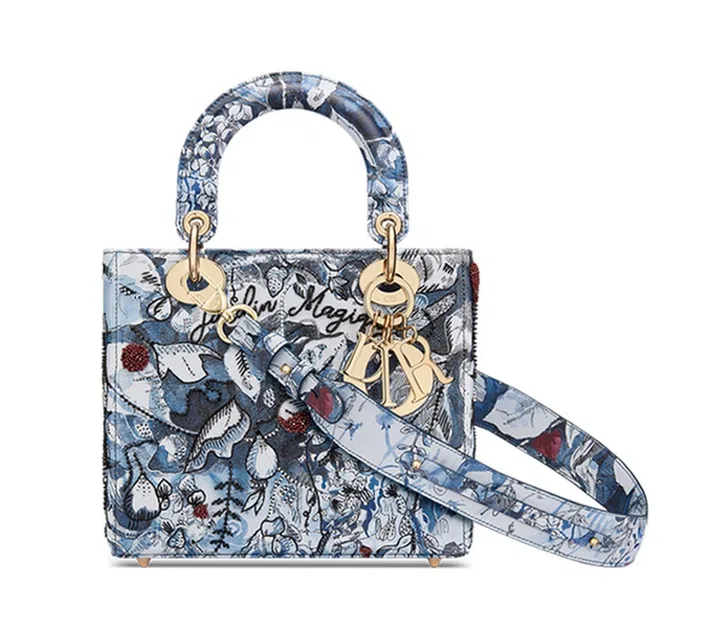 这款从魔法世界汲取灵感的手袋采用丹宁蓝色牛皮革制作,并刺绣以精美的Dior Jardin Magique 图案,展现出一派典雅迷人的田园风情。