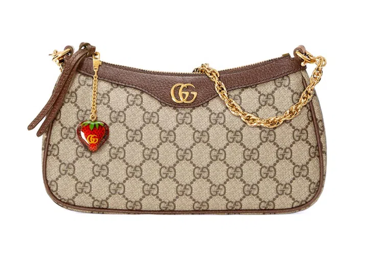 米色及乌木色组合的GG Supreme帆布手袋(GG标识源自1930年代的Gucci钻石菱格纹),除精美金色包链外,也配备一条时尚红绿帆布款肩带。袋身点缀心形“草莓”挂坠,为情人节营造浪漫气氛。