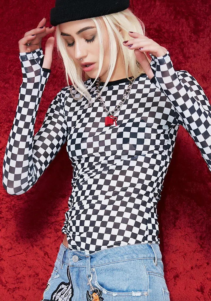 欧普风格的黑白棋格纹,穿上身极具视觉冲击力。可内搭一件黑色bralette,其醒目图案会减少一定的透视感,让你单穿既清凉又不会感觉肌肤暴露太多。