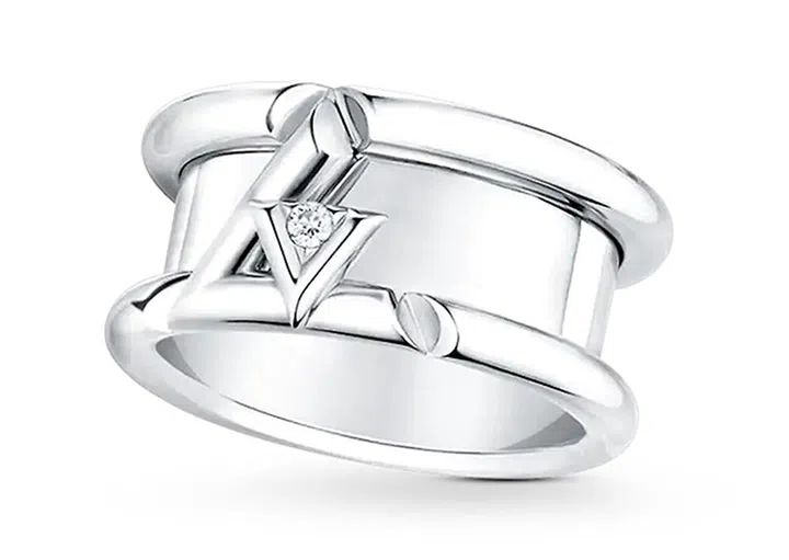 Louis Vuitton的经典标志,以精湛的切割工艺呈现。大L与小V的之间镶嵌着一颗璀璨的钻石,造型中性又富有活力与现代感,佩戴上即可为造型注入独特魅力。