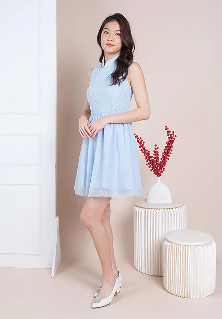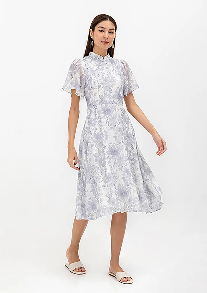 Love & Bravery的这件花系旗袍,蓝色的花纹+飘逸的袖子 & 裙摆+中式领结的设计很有温婉大小姐的范儿。A字裙的剪裁具有收腰的功能,既显腿长又凸显腰线~
