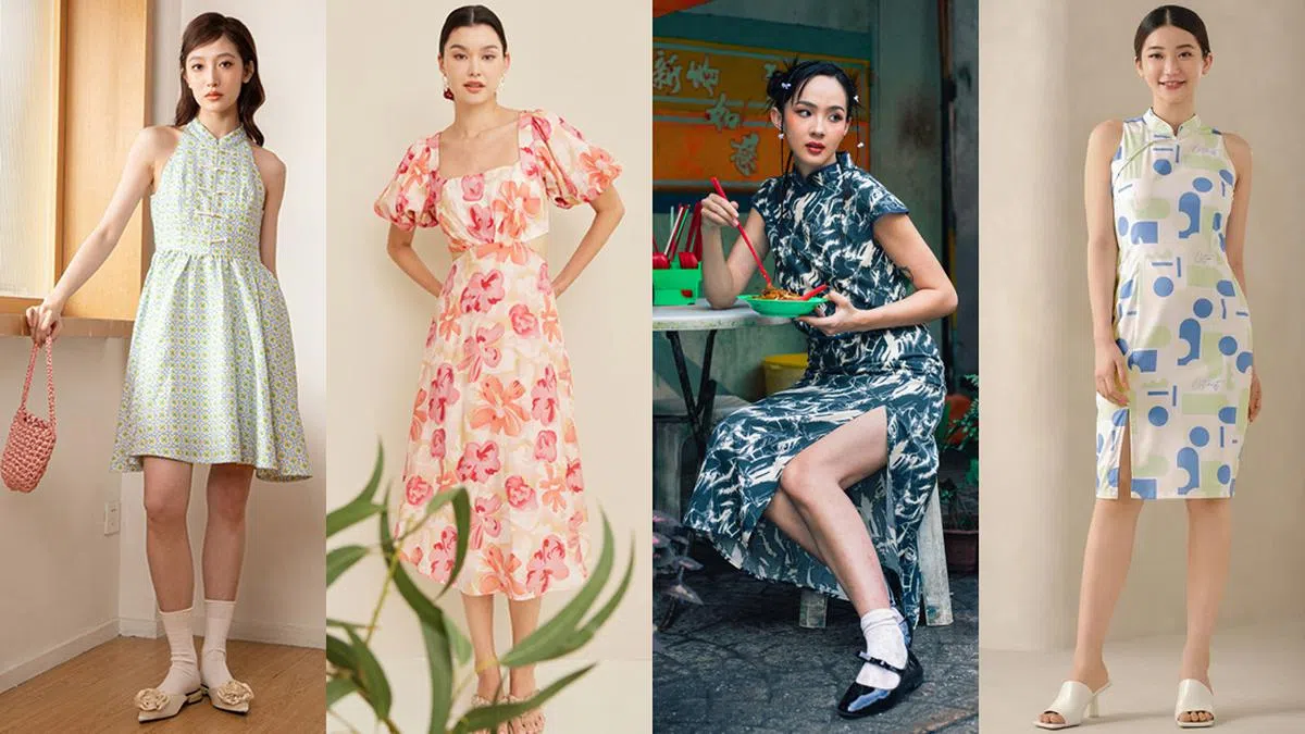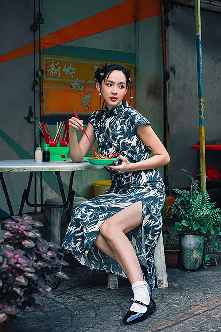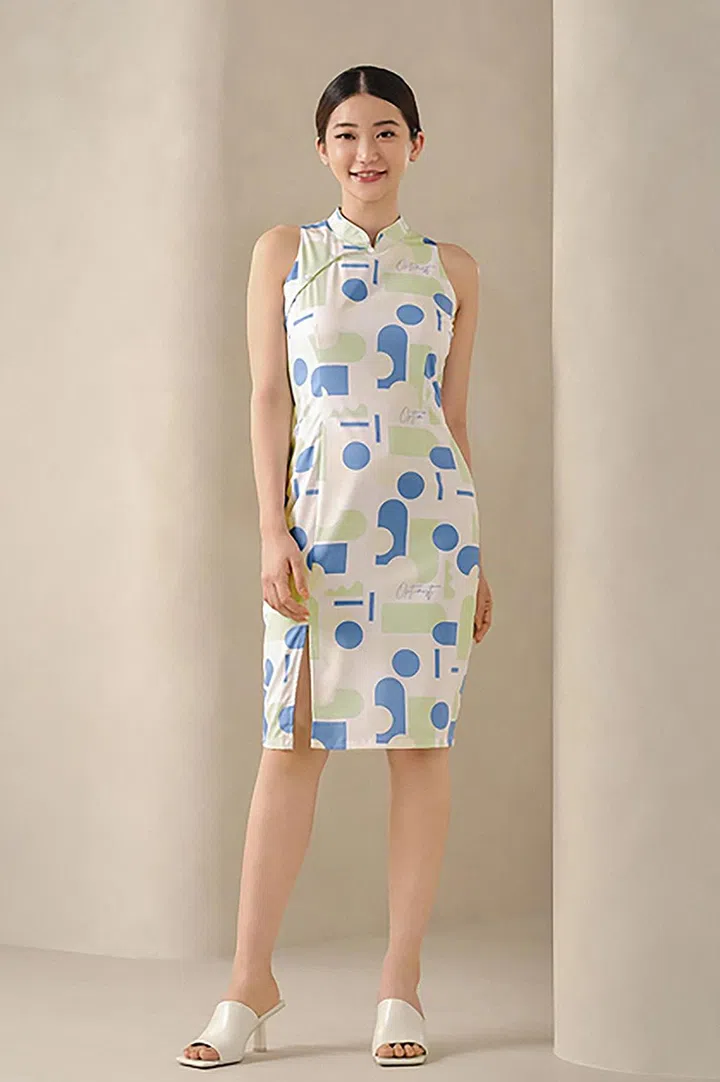 旗袍可是不少女生过年到亲戚家串门的首选服装,怎么穿得出挑?你可以从旗袍上的花纹入手噢:Y21的这款旗袍大玩几合图形,通过鲜艳的蓝色 + 绿色的圆形和方形,穿上后更显灵动俏皮。
