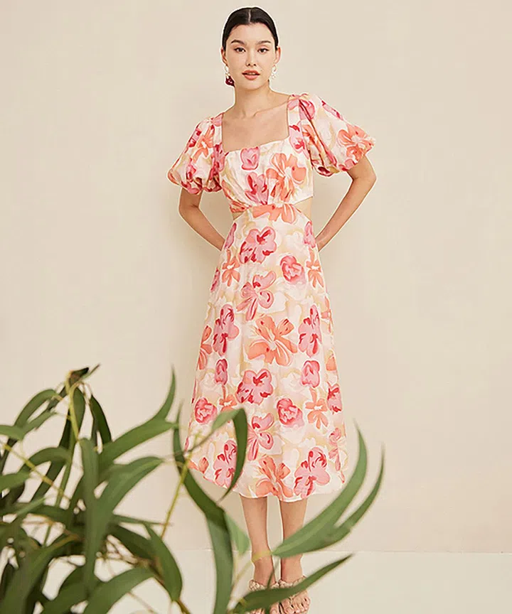 新年不是只能穿旗袍噢,一件桃色(或是红色/粉色)的连衣裙也很有氛围感!Her Velvet Vase的这件花系连衣裙满满节日气息,腰间的镂空设计有性感又俏皮,新年过后也能穿去约会噢~