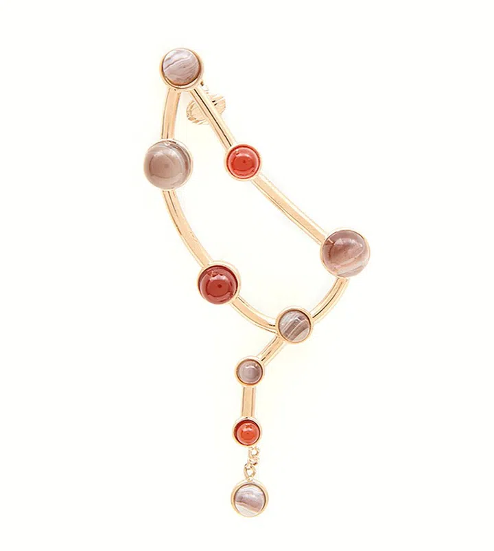Chloe的星座系列,以各星座的星象图形状打造首饰。比如这款耳坠的造型,就接近于狮子座在夜空中的星象。而且每款首饰所装饰的宝石,都采用了符合各星座自然能量的疗愈宝石。
