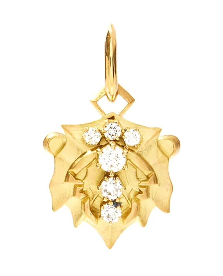 1948年创办于纽约的设计师同名品牌David Webb,作品灵感来源于对大自然的感悟。他善于演绎自然及动物形态,黄金、珐琅、色彩、纹理、几何形状等各种元素构成了他的作品。这款17.5 x 25.0毫米的狮子座项坠,装饰璀璨钻石狮子座符号(另一面为超有艺术感的狮爪造型),另外“光芒万丈”的太阳射线纹理,也让人想到狮子座的守护星太阳。
