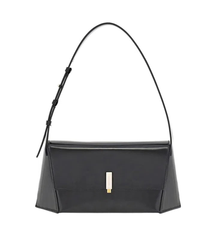 这款巧妙融汇几何线条的犀利肩背包,不同角度观看犹如欣赏一座现代建筑,结构新颖有趣。手袋配备可调节肩带,并缀饰Gancini标识金属扣饰,整体简约利落,可搭配日常职场装,也能搭配精致小礼服。