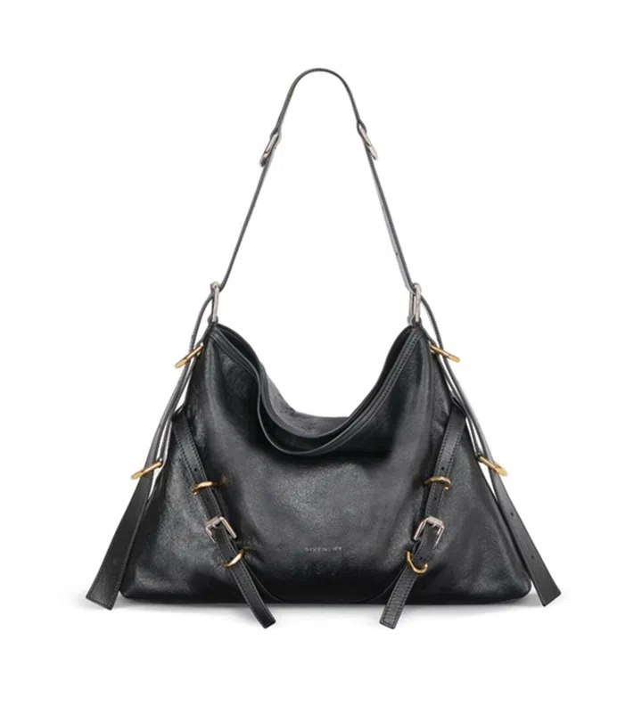 随性并带一丝反叛的巴黎女人态度——Givenchy创意总监Matthew M. Williams因此为这个全新手袋系列取名为Voyou(在法文中带有“坏男孩”之意)。该袋款共推出三个尺寸(大、中、迷你)——大和中型手袋的重量让前后两片皮革自然垂坠遮住袋口,迷你型则是拉链设计;slouchy的V形手袋饰以银搭扣及金D环铁饰,可让你随造型手提或当腋下袋/肩袋/斜肩袋。