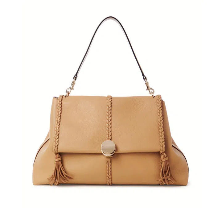 Chloé今年春夏系列推出的最新手袋系列。手袋揉合精湛工艺与精巧细节,如编织皮革和取材自品牌经典珠宝设计的特色金属硬币袋扣。系列总共包括三款设计:Penelope肩袋、Penelope中型翻盖手袋及Penelope手握袋。