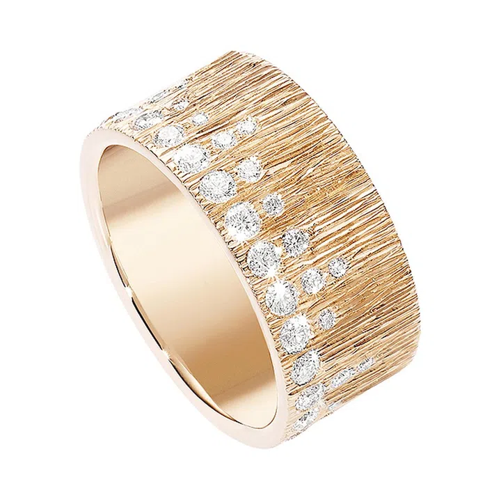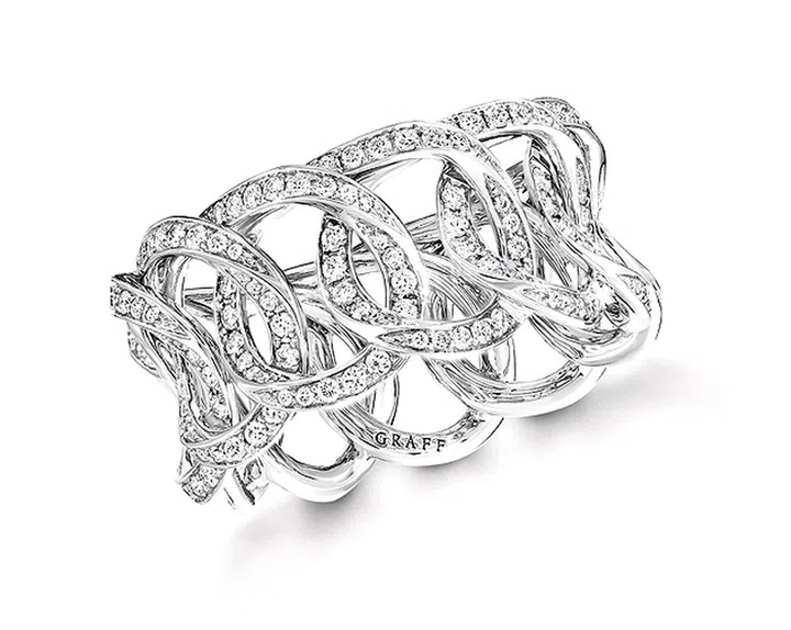 以打造璀璨钻饰闻名的Graff,从美国画家Cy Twombly的画作撷取灵感,设计出这款优雅环形造型的密镶钻石戒指。虽然戒指宽达11mm,但其通透的结构却仍然让它显得轻盈动人。