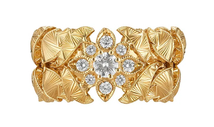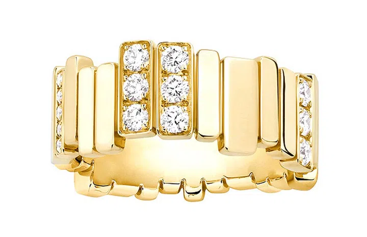 这款戒指采用“宫廷式图腾”(Palace Decoration)细节,在黄金上打造出华美的丝绸质感。同时品牌运用精湛的饰金工艺,为戒指绣上颗颗圆形美钻,排列错落有致、光芒闪烁,设计极具韵律感。
