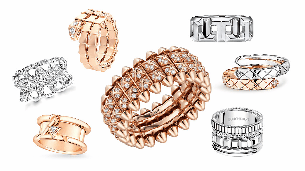 叛逆优雅的Clash de Cartier戒指,方形饰钉数目加倍,而且两侧设置灵动自如的铆钉,以更加丰盈宽大的造型,挑战传统设计美学,也展现出桀骜不驯的摇滚风范。