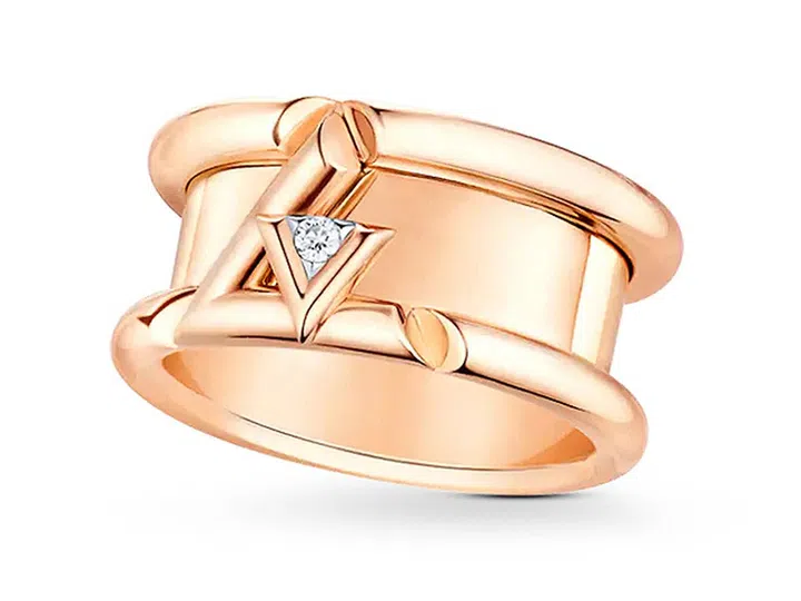 精巧的镶钻V字母,结合与戒指边缘浑然一体的较大L字母,造型简约现代且具图形设计美感。日常搭配职场造型时,还可混搭其他简约风格的白金首饰。