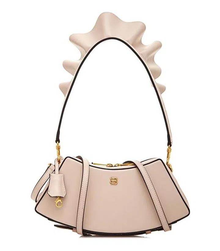 这款手袋出自与马来西亚模特Scha Alyahya合作的BONIA x SCHA系列,造型新颖有趣,肩带采用荷叶边造型,袋身的弧度也让它更显与众不同。