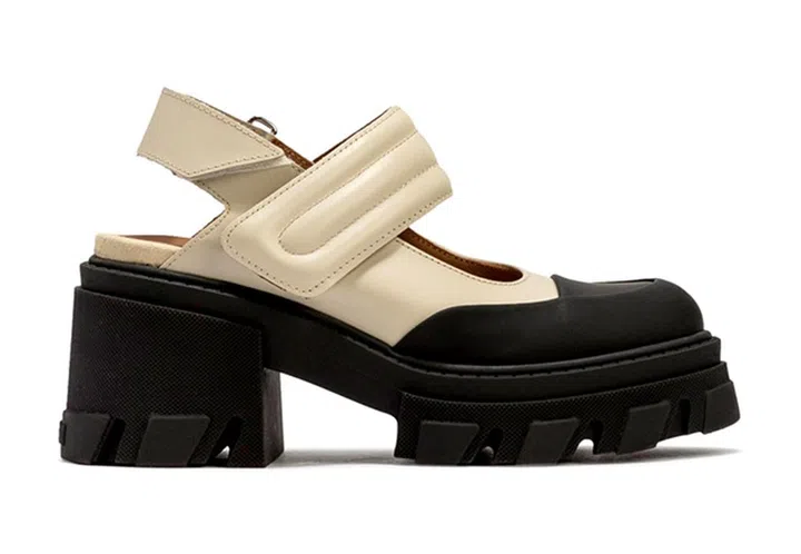 这款来自Ganni的皮革鞋款,造型更加大胆醒目。米色鞋面加上粗犷的黑色高跟橡胶鞋底,设计简约、百搭,穿上修身印花喇叭裤或半透视裤装,显高又出众。