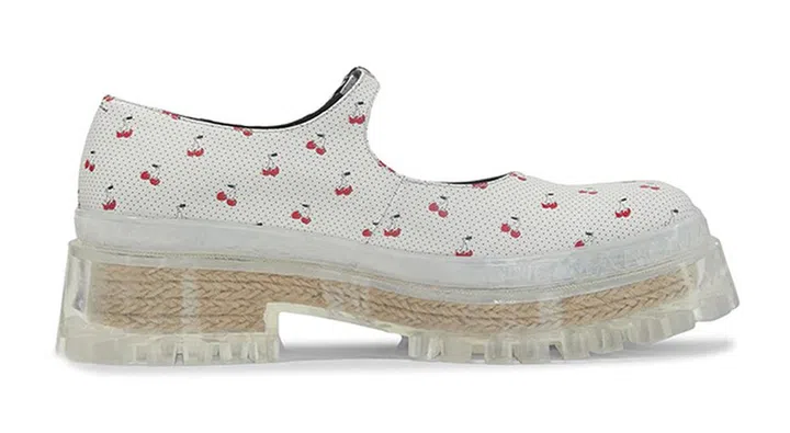 极具学院风的玛丽珍鞋,穿起来不仅可爱又减龄,而且搭配裙装也更显独特俏皮。这款带樱桃图案的皮革玛丽珍鞋,并将草编鞋底和透明橡胶鞋底结合起来,设计充满新意。