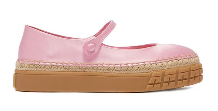 同样采用草编+橡胶鞋底的,还有这款Prada玛丽珍鞋。鞋面以粉色缎质打造,风格唯美,少女感十足,也另有黑色及蓝色款可选。