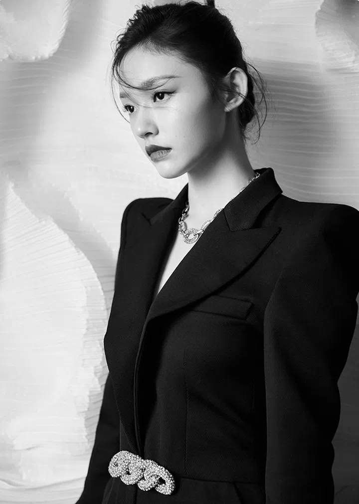 林允以一身Giuseppe di Morabito连体黑西装搭配长靴亮相“年轻力中国”盛典,并佩戴Pomellato La Gioia高级珠宝Catene系列项链及戒指,造型贵气十足。