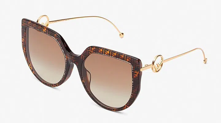 这款”F IS FENDI”大廓形印花猫眼墨镜以玳瑁纹板材精心打造,镜框上缀有品牌经典“FF”表示 ,配有棕色渐变镜片,而纤细的金色镜腿上还设有圆形时装屋标志,处处可见巧思。
