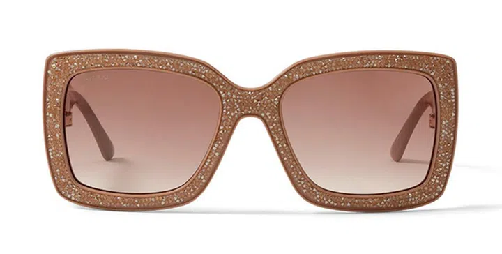这款Jimmy Choo VIV/S 55 裸色施华洛世奇水晶方框墨镜,巧妙平衡优美造型与时尚个性。裸色反光丙烯酸酯搭配精美金色施华洛世奇水晶石面料,于意大利制作。铰链处装饰刻印品牌 Logo 的铜金色金属饰边,为华丽指数加分。