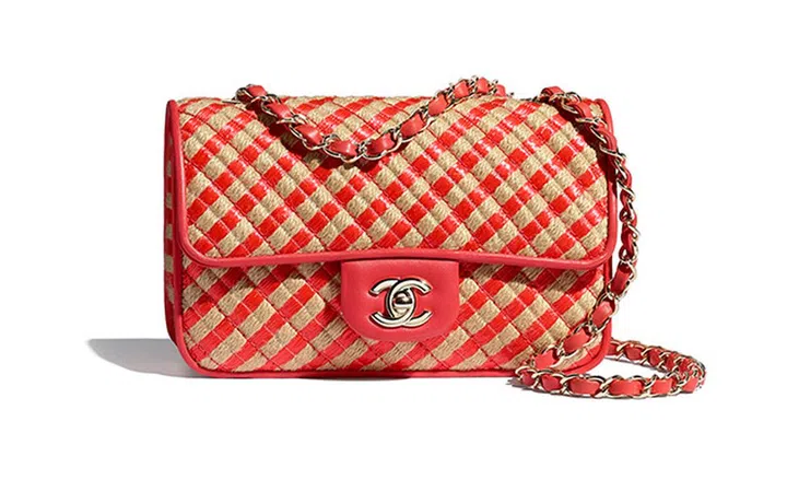 Chanel的这款Flap bag以红色装饰的拉菲草编织及皮革内衬打造,身形小巧(13 × 21 × 9 cm),便于携带。而且,草编包也是今年春夏的流行款式。