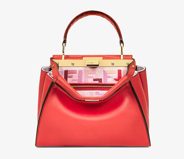 品牌的春节限定系列手袋,采用柔软深红色小牛皮打造经典Peekaboo迷你款手袋,帆布衬里展示粉色调FF刺绣,并配备可拆卸肩带供你斜挎。