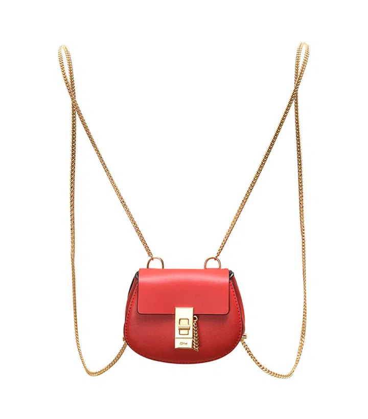 Chloé的新年系列包括装饰牛仔布及红色皮革的Daria Mini及Drew系列手袋,还有适合送礼的织绳手链、墨镜、发饰、耳环,以及个性的耳机袋及Fredy水瓶袋。而这款全红色包包,不仅是款精致链袋,还可以当作背包背。