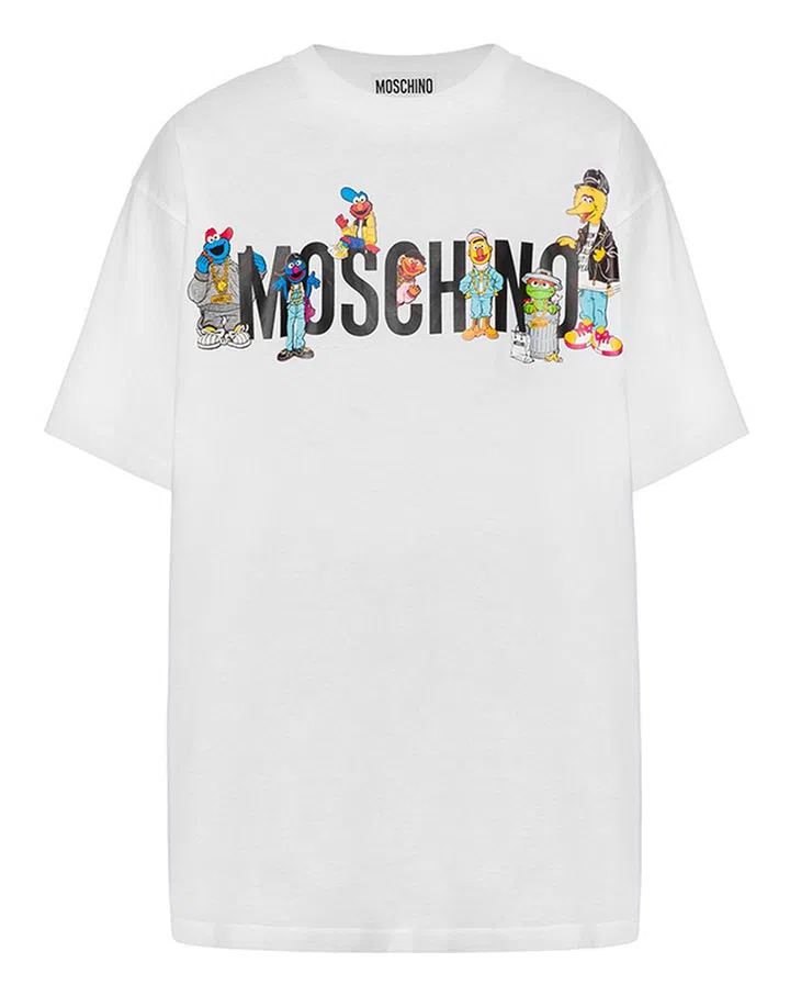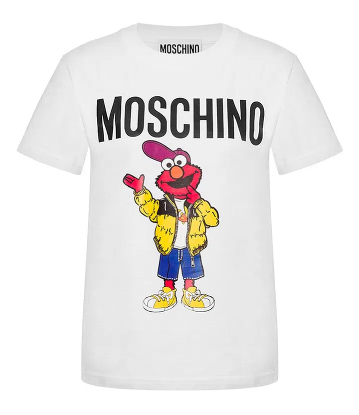 Moschino与知名儿童电视节目《Sesame Street》推出联名系列,将节目中的角色如 Elmo, Cookie Monster, Big Bird, Oscar the Grouch, Grover,以及Bert和Ernie纷纷融入设计。