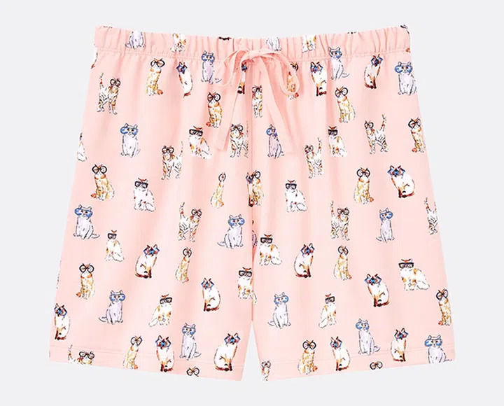 除了上衣,猫咪印花的设计还包括多种不同配色的居家短裤。在家搭配背心或T恤穿着,休闲、凉快又可爱。顺带一提,除了猫咪印花,该系列还有各种花卉图案的短裤及连衣裙等。