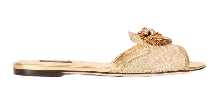 休闲拖鞋也能华丽典雅!采用Taormina蕾丝制作,鞋面则以Dolce & Gabbana招牌的Devotion心形装饰点缀,贵气十足,绝对出得了场面。