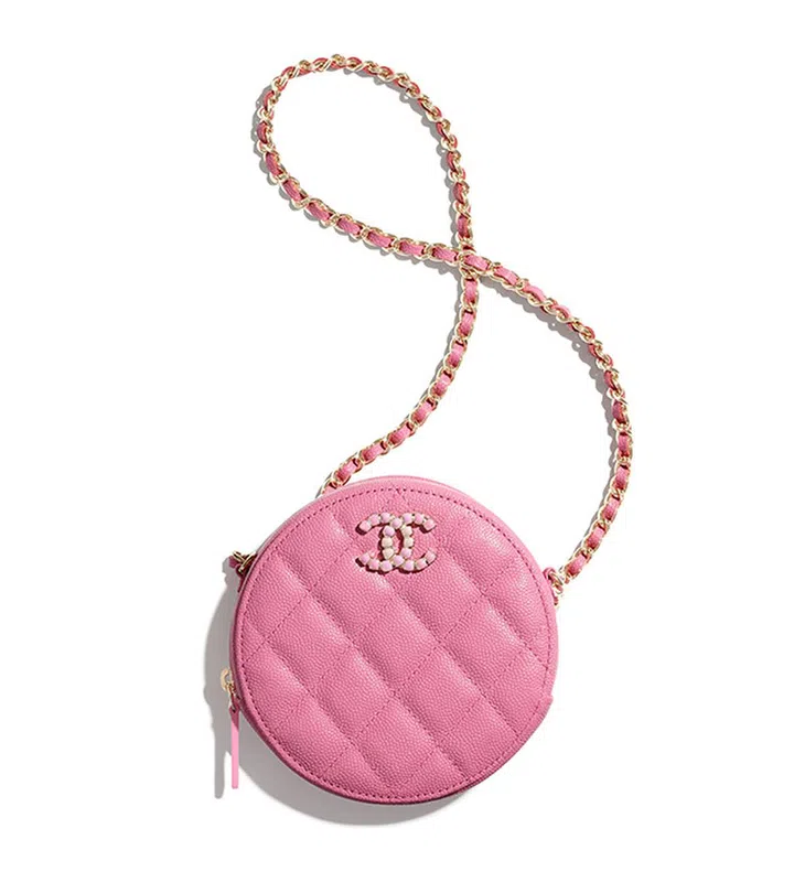 糖果粉色调粒面皮革,圆形轮廓玩味十足;另外,手袋也有一定厚度,仿佛一个小巧的化妆盒,让你可以把气垫粉饼或小瓶防晒霜也装进去。
