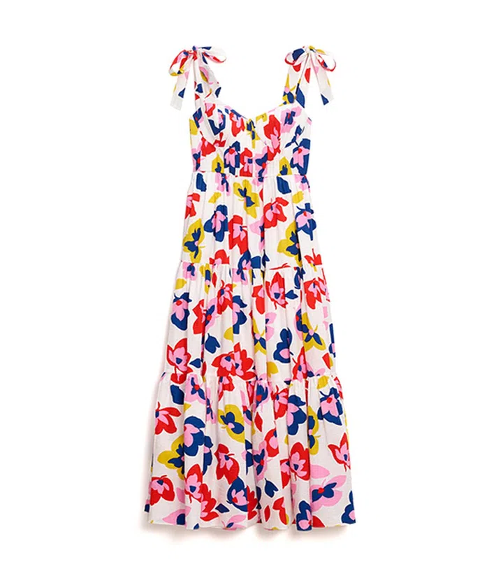 Kate Spade今年最新夏日系列,成衣以轻盈材质及大胆配色为设计要点。印花图案也丰富多样,从花卉、绿叶、格纹、心形、条纹、monogram应有尽有,并有手袋、鞋履、时尚首饰甚至应景的手机壳可供搭配。推荐你这款多层次的彩色花卉连衣裙,视觉上轻松欢乐,在阳光下极衬肤色,而且拍照也很抢眼。