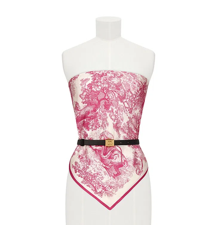 在该系列中,品牌的toile de Jouy印花被应用于各式短裙、连衣裙、短裤及泳衣上,同时配以大胆醒目的蓝、橙、粉。这款丝巾还可灵活造型,比如当作一款性感上衣。