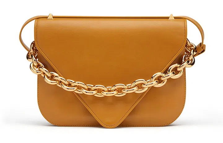 亮相于Wardrobe 02系列的Bottega Veneta The Mount系列,将品牌经典的粗链元素注入其中,分为斜挎包与手提包,透过不同形状和细节,打造前卫有型的摩登手袋,适合日夜背携。其中,The Mount 信封斜挎包采用矩形轮廓包身,搭配三角形的翻盖和金属链条为设计亮点,极简而利落。