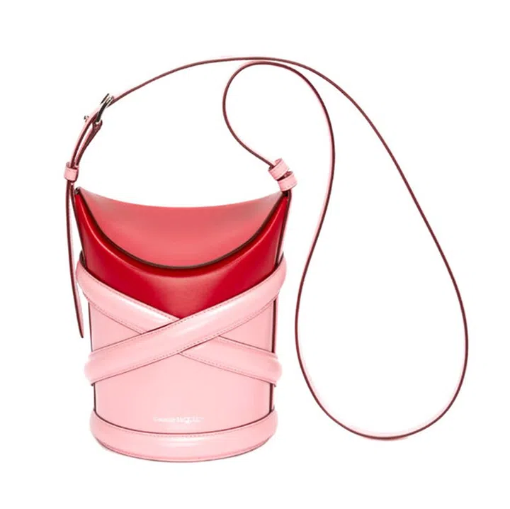 Alexander McQueen 2021早秋系列中的粉红拼色Curve水桶包以马术挽具为灵感,在水桶包的外围拼缝两条交叉绑带,在率性风格中注入甜美气息。
