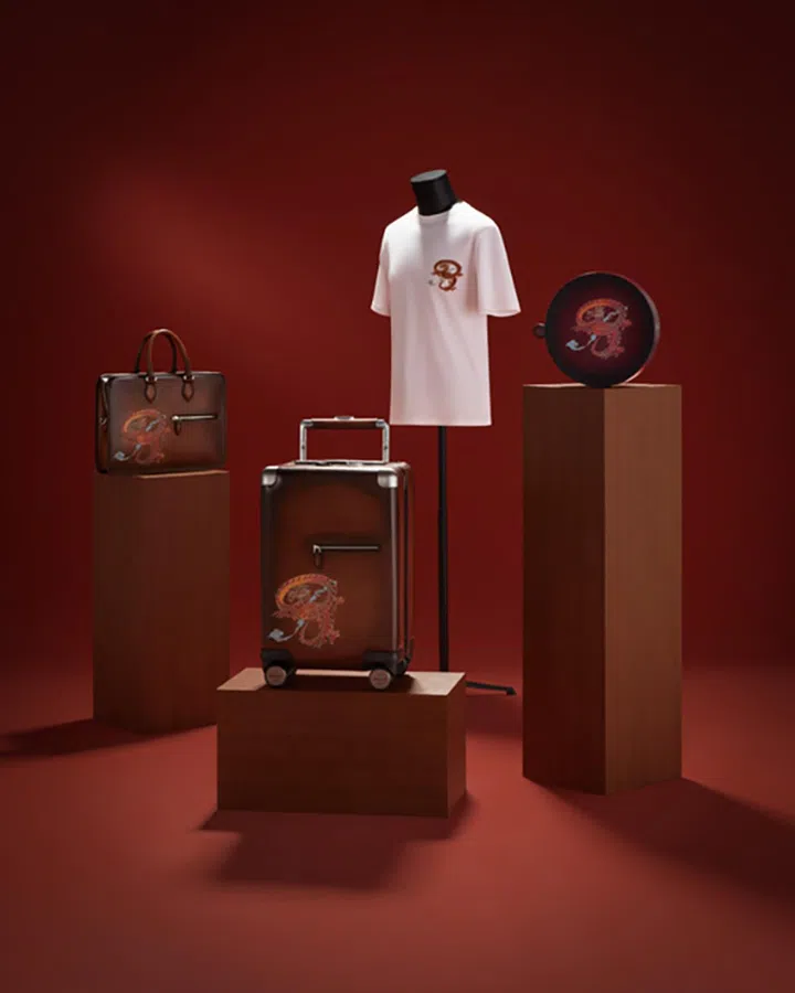 Berluti的龙年胶囊系列,灵感来源于中华传统文化中的龙图腾。这一系列通过品牌标志性的手工工艺,巧妙地将龙纹图案与其经典元素相融合。采用Patina古法染色技艺,系列展现了如Cacao Intenso和St. Emilion Red等经典色调的皮革制品,营造出新年的喜庆氛围。系列包括成衣、包袋、小皮具和家居用品,还展现了巧夺天工的皮革刺青和低调内敛的镭射雕纹,彰显奢华细节,满足现代绅士在各种场合的需求。