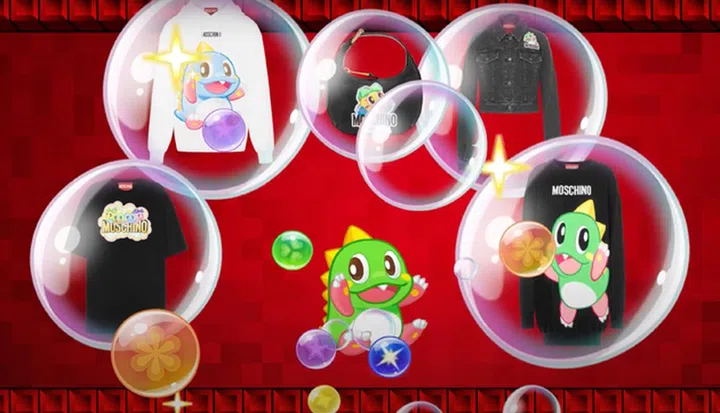 Moschino则以经典电子游戏形象“泡泡龙”为主角(1986年日本TAITO公司推出的电子游戏),让这两只绿色及蓝色的双胞胎兄弟龙Bub和Bob在Moschino上衣、裤装、鞋履、包袋上玩趣回归,带来一波回忆杀。