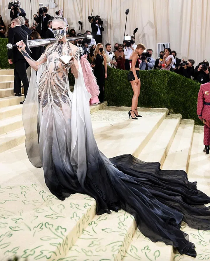加拿大电音天后Grimes的这身未来感造型,手持长剑,气质暗黑神秘好似女巫,是小编个人最爱的一个。服装造型来自Iris van Herpen,当晚巴西跨性别超模Valentina Sampaio也穿着该品牌登场,两个超凡造型都给人留下深刻印象。