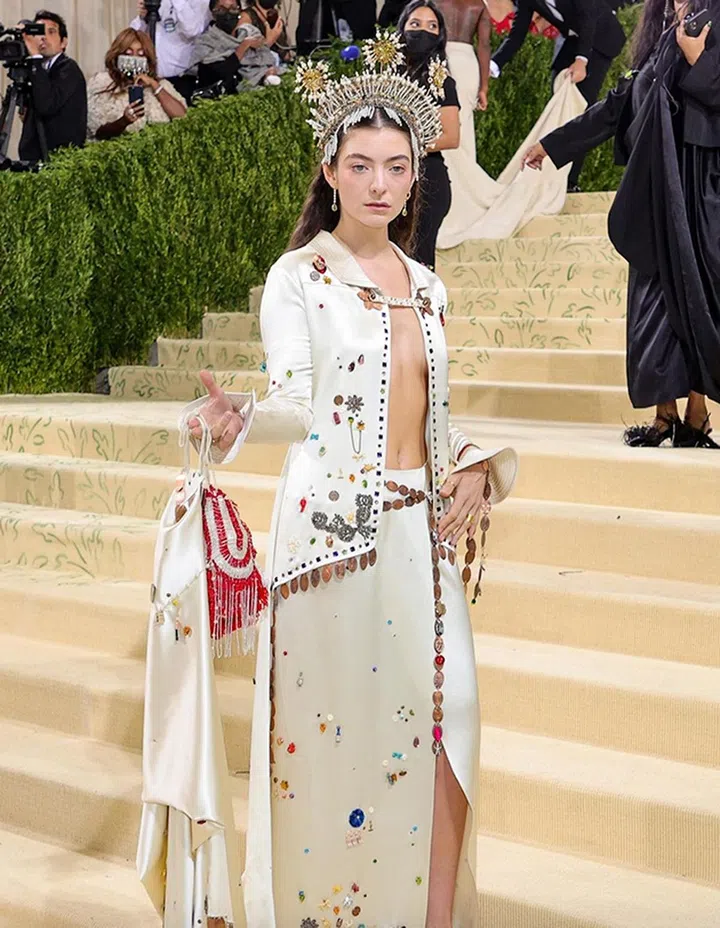 来自纽西兰的才女歌手Lorde气质空灵,这次穿着Bode礼服并佩戴皇冠登场,服装上镶嵌各种有趣缀饰,并还有1890年起的各式硬币,讲述一段历史故事。