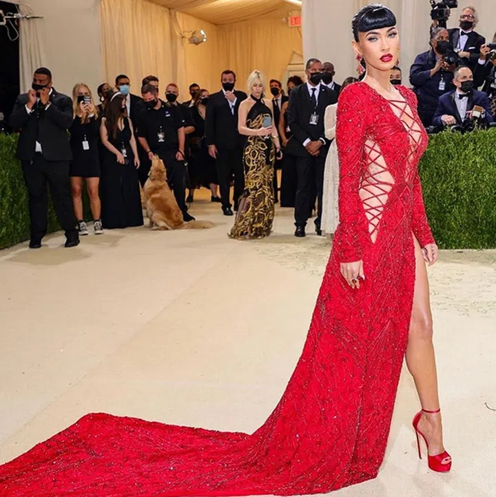 Megan Fox穿着Dundas红色礼服配搭Lorraine Schwartz珠宝及Jimmy Choo高跟鞋。开到肚脐的超低胸剪裁展现性感女王气势,腰部两侧也同样采用绑带设计露出肌肤,以超辣造型致敬1950年代的性感女星Bettie Page。