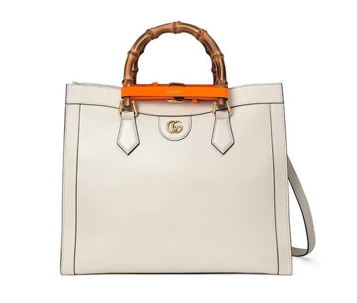 黛安娜王妃生前最爱用的竹节包,曾陪她现身于大大小小的场合,包括造访罗马、出席哈利王子运动日,甚至是上健身房等。时隔30年,创意总监Alessandro Michele重磅推出竹节包升级版,并正式命名“Diana”。新版Diana保留了原有的简约剪裁线条和标志性竹节手柄,再缀以GG 金属logo以及萤光皮革竹节绑带,注入新鲜感。不说你不知,荧光皮革绑带的灵感来自于制作过程中工匠们为乐保持竹节手柄形状而用的保护带。