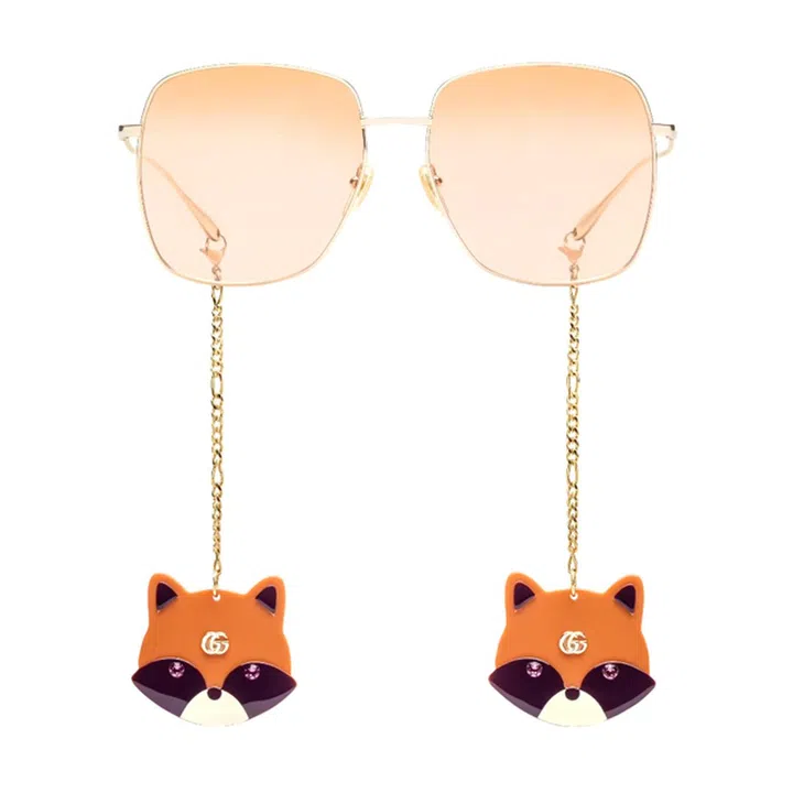首先推荐这款来自Gucci的超可爱墨镜!在黄金色镜框末端垂吊着两只带有"GG"标志的浣熊链式吊坠,俏皮感十足!不必担心墨镜过重,带着不舒服,这链式吊坠是可拆卸式的,而墨镜设计也是超轻盈款式。