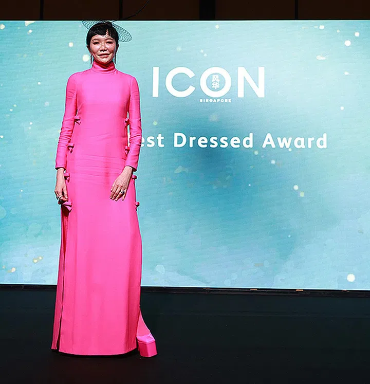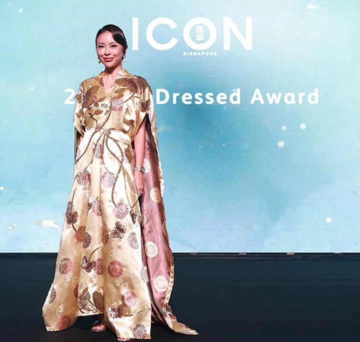 或许你不知道,Ashley Woo Toh曾在自己的婚礼穿过这件定制款桃红色礼服,由Fang Lu精心打造。然而,为了今年的《风华》晚宴,她将这件礼服进行改良,变成两件式的设计,将流行的短款风格和服装上细腻的刺绣及中国式流苏元素,完美地结合在一起,用现代视角彰显了她对“新中式”的独特见解。